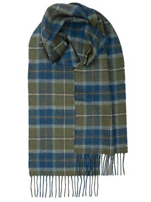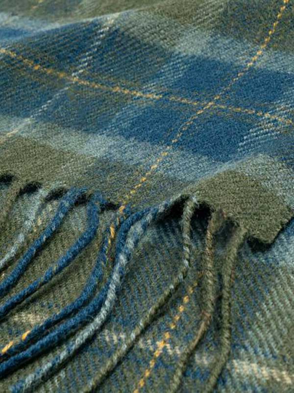 Die Scottish Borderland Lammwolldecke ist ein olivgrüner Tartan mit königsblauen, cremefarbenen und senffarbenen Karos.