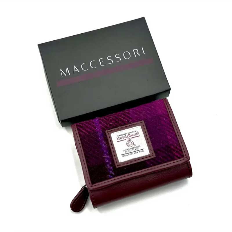 Dreifach faltbare Handtasche aus Harris Tweed in Lila-Karo.