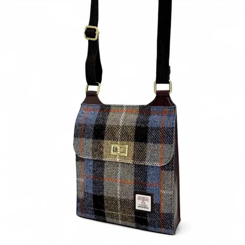 Dreifach gefaltete Handtasche aus Harris Tweed in Blau/Braun kariert.