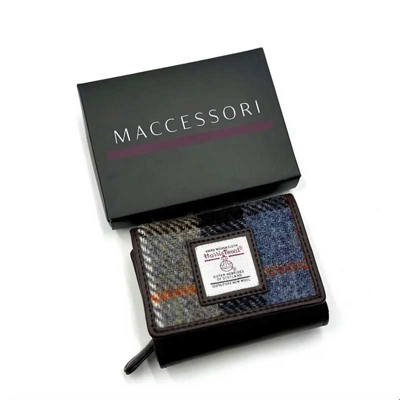 Dreifach gefaltete Handtasche aus Harris Tweed in Blau/Braun kariert