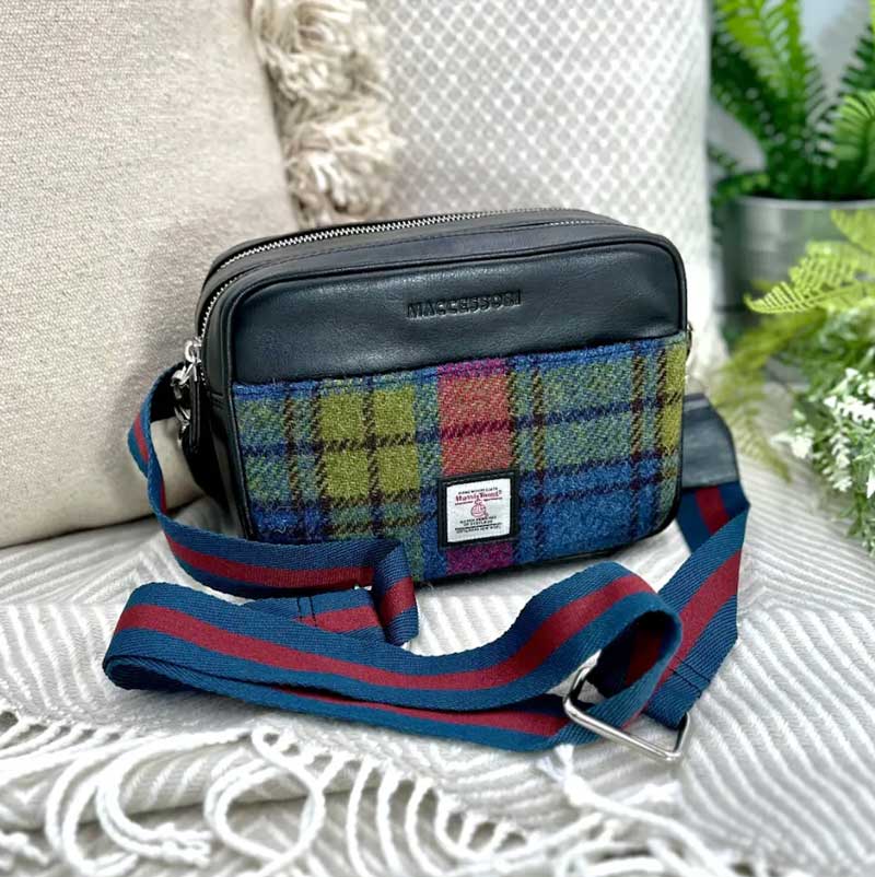 Harris Tweed Kameratasche in Blau/Rosa Karo.