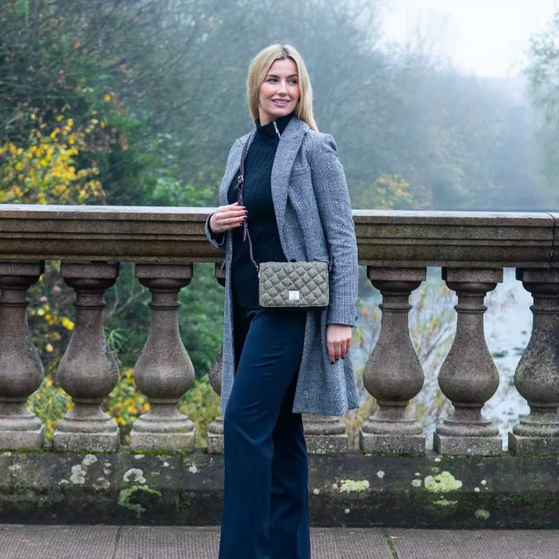 Jedes Harris-Tweed-Modell wird mit einem farblich passenden Schulterriemen geliefert. Diese ikonische Harris-Tweed-Tasche kann tagsüber getragen und dank des abnehmbaren Riemens abends als Clutch verwendet werden.