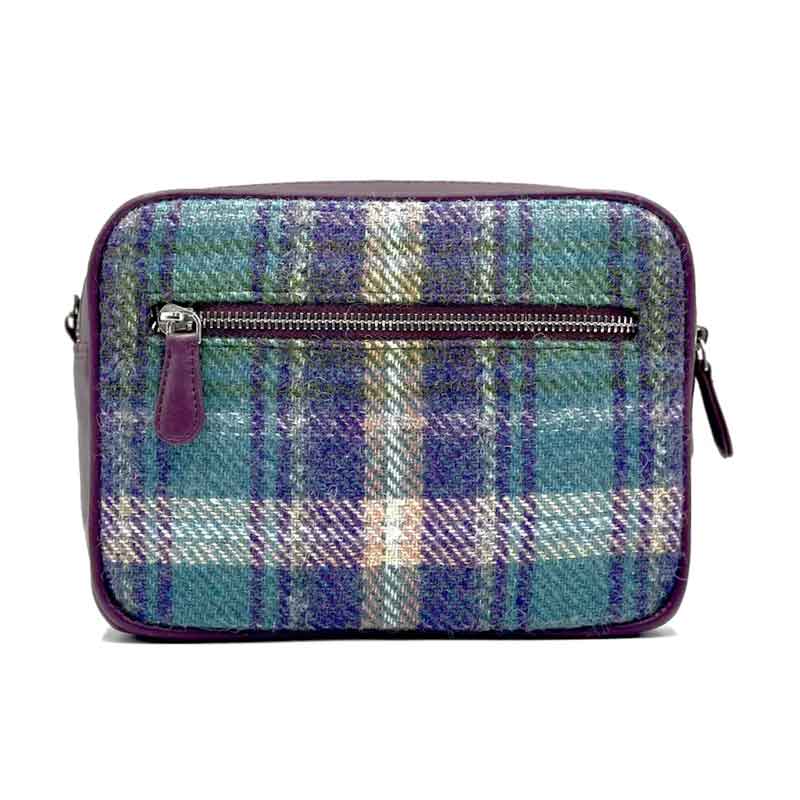 Harris Tweed Kameratasche in Grün/Lila Karomuster.