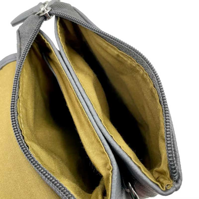 Die Tasche verfügt über zwei Innentaschen mit Reißverschluss. Zusätzlich gibt es ein offenes Fach auf der Vorderseite (unter der Klappe) für Gegenstände, die Sie schnell griffbereit haben möchten. Auf der Rückseite befindet sich außerdem ein Reißverschlussfach. Sie können unsere Harris Tweed Mini Bag mit dem vollständig verstellbaren Schulterriemen über der Schulter oder quer über dem Körper tragen und so die Hände frei haben.