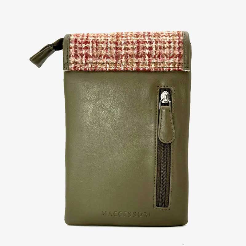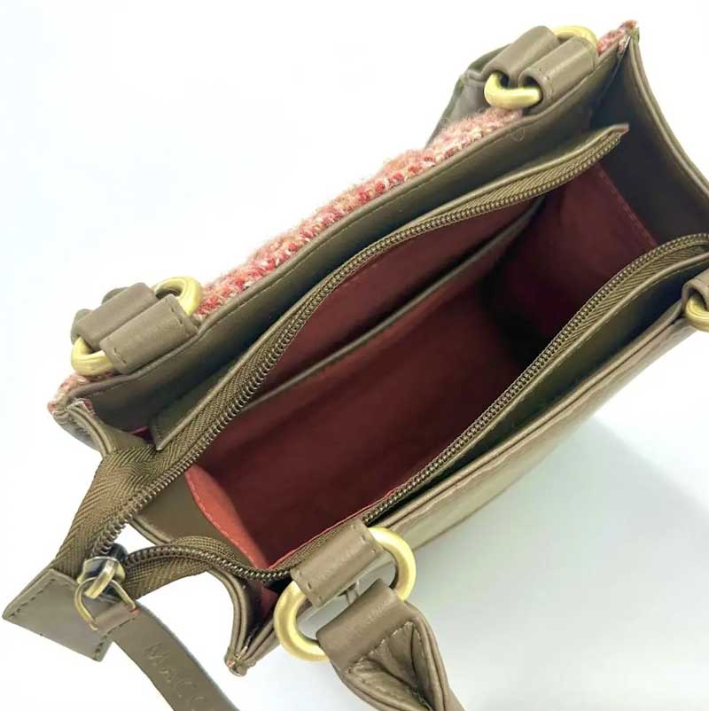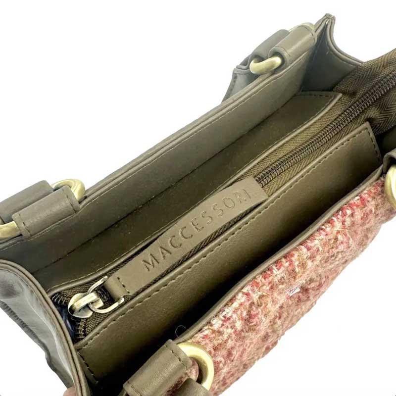 Die Harris-Tweed-Tasche verfügt über eine Reißverschlusstasche auf der Rückseite, ein offenes Fach und eine Innentasche mit Reißverschluss.