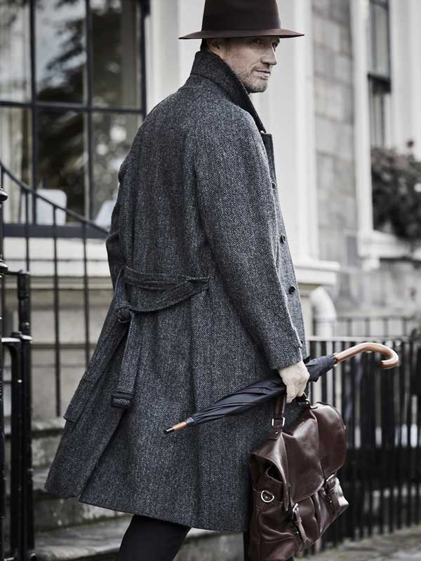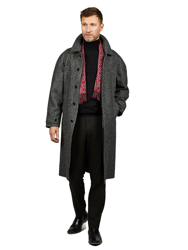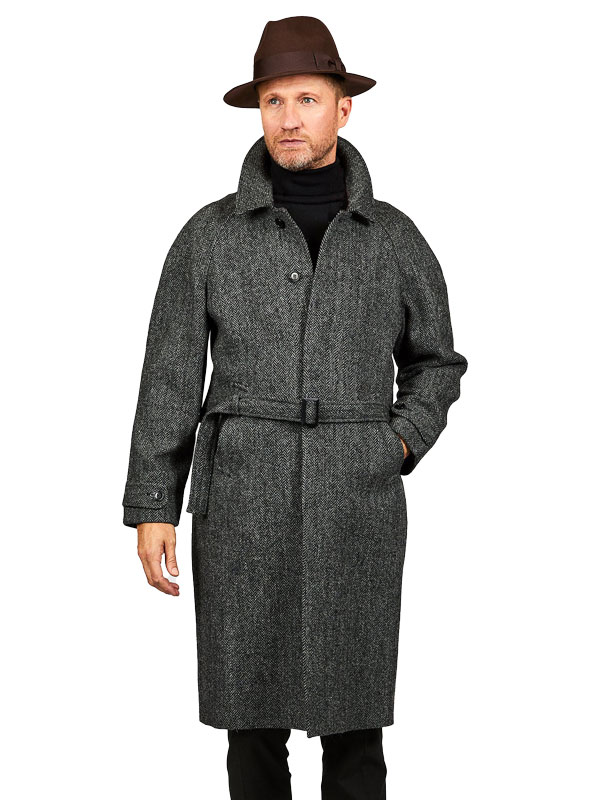 – Anthrazitfarbener Harris Tweed im Fischgrätmuster – Handgewebt aus 100 % reiner Wolle – Klassische Passform – Raglanärmel – Zwei Seitentaschen plus Innentasche für Handschuhe/Schal – Verdeckte Knopfleiste – Bindegürtel mit Schieber – Graues Paisley-Futter