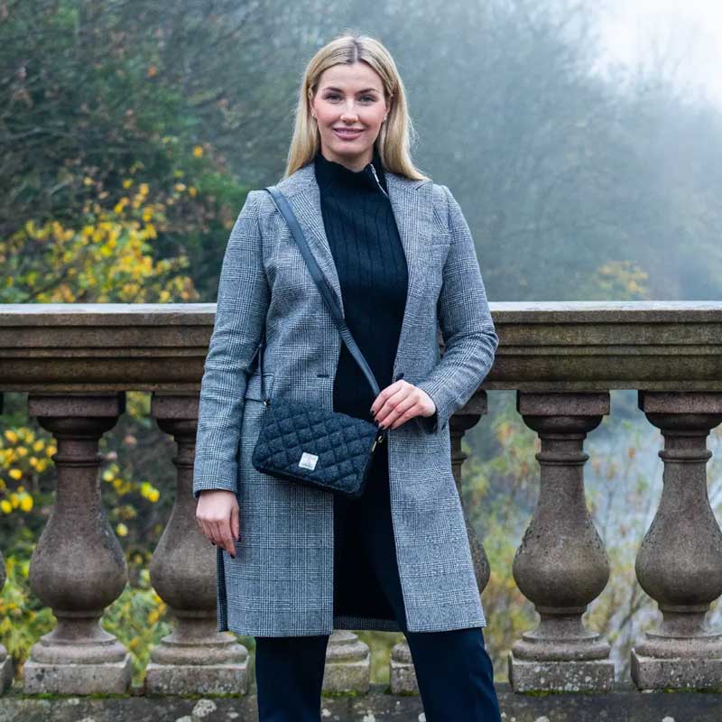 Lernen Sie unsere gesteppte Mini-Tragetasche aus Harris Tweed kennen. Diese stilvolle Tasche ist aus rautenförmig gestepptem Harris Tweed gefertigt und wird mit einem Reißverschluss geschlossen.